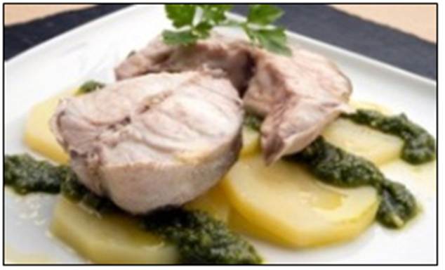בהתחלה עד קבלת האמולסיה, מהר יותר אחר-כך c. מוסיפים למיונז את החומרים הקצוצים ומערבבים היטב d. משאירים לייצב מינימום שעה 2. מכינים את הציר (אפשר להכין מראש ולשמור במקרר) a. שמים כל חומרי הציר בסיר b. מרתיחים חצי שעה 3. מבשלים את הדג a. מכניסים את הדג לציר הרותח b. מכסים c. כאשר שוב מתחיל לרתוח מכבים את האש ומשאירים חצי שעה d. מוציאם את הדג מהציר ומניחים על מגש לקירור e. מורידים את עור הדג כאשר קר (לא לפני), אפשר גם