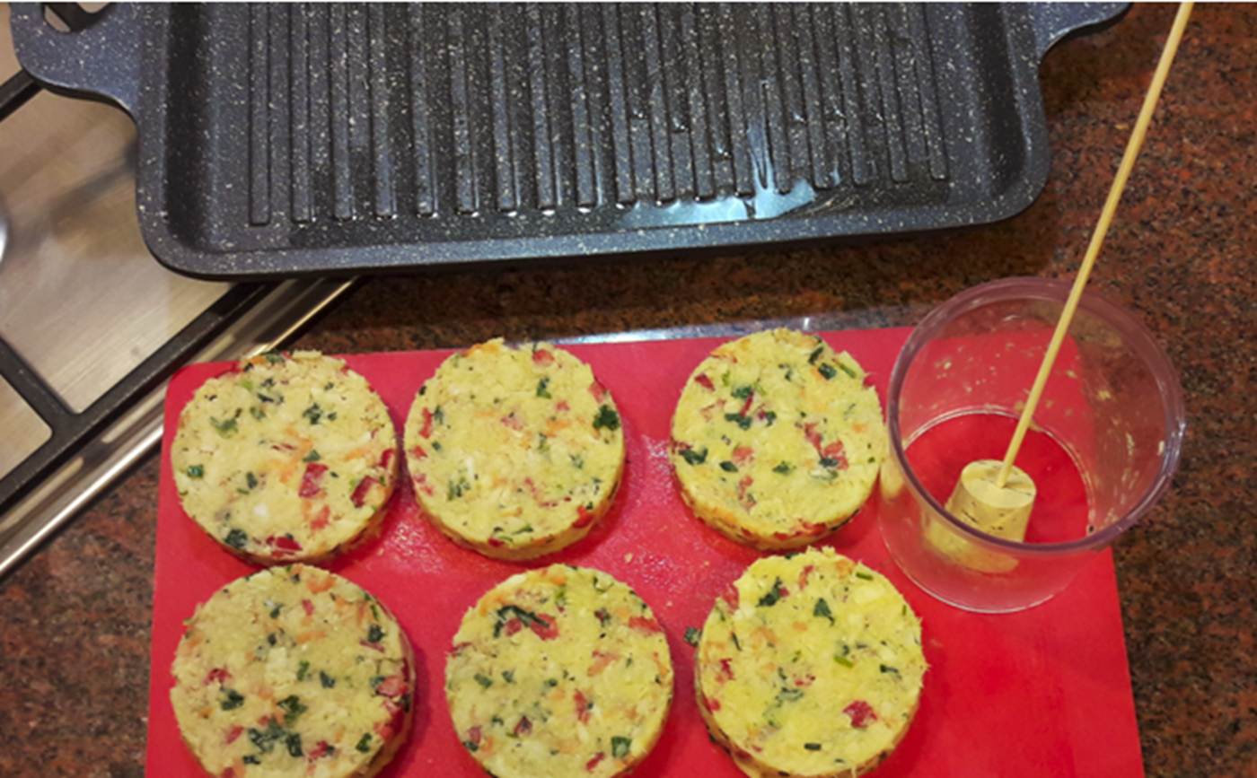 (קל יותר לעבוד כאשר התערובת קרה) 4. בונים את ההמבורגרים ומשחימים אותם אה לה פלנצ'ה (למטה: