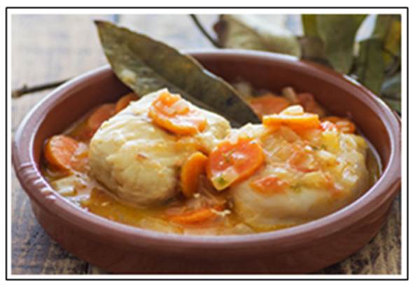 6 פילה דג לבן בקוביות (או פרוסות) 1 בצל ירוק מקוצץ 1 שן שום מקוצץ 2 גזר בפרוסות 2 עגבניות בשלות בקוביות כף קמח כוס ציר דגים או מים ½ כוס יין לבן יבש 1.