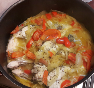ללא קליפה 2 פילפל מתוק אדומים – חתוך לרצועות 1 פולפל מתוק ירוק – חתוך לרצועות 2 עגבניות – 1 כוס יין לבן ייבש כפית חומץ 1 כפית פפריקה חריפה או מתוקה לפי הטעם 2 עלה דפנה זעפרן (סודות
