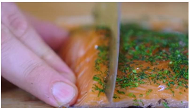 של 1 לימון 1. מערבבים את המלח, סוכר וקליפת לימון 2. בונים שיכבה של חצי מהתערובת במגש שטוח 3. מניחים את פילה הסלמון על שכבת התערובת 4. מפזרים את השמיר הקצוץ מעל הסלמון 5. מכסים את הסלמון עם יתר התערובת 6. מכניסים למקרר 12 שעות 7. מוציאים מהמקרר ומנקים את הפילה ממלח-סוכר במים 8. מפזרים עוד קצת שמיר קצוץ אם יש צורך 9. חותכים פרוסות דקות ואוכלים על טוסט עם שמנת חמוצה |