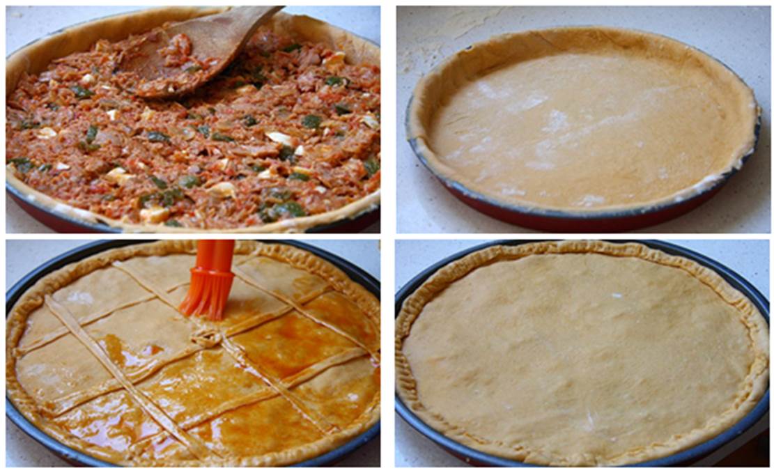 איתה את תחתית הקיש במגש עגול משומן בקצת שמן מהמילוי או שמן זית 3. ממלאים עם המילוי ומכסים עם החצי השני של הבצק (גם דק-דק) 4. מחוררים את המיכסה הרבה פעמים עם מזלג כדי למנוע נפוח