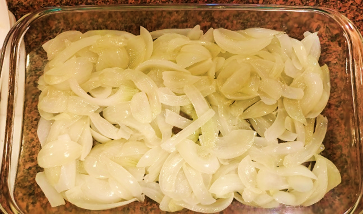 דקות 5. מפזרים את הבצל בתחתית תבנית אפייה