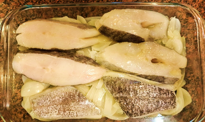 6. מניחים את פילה הדג מעל הבצל