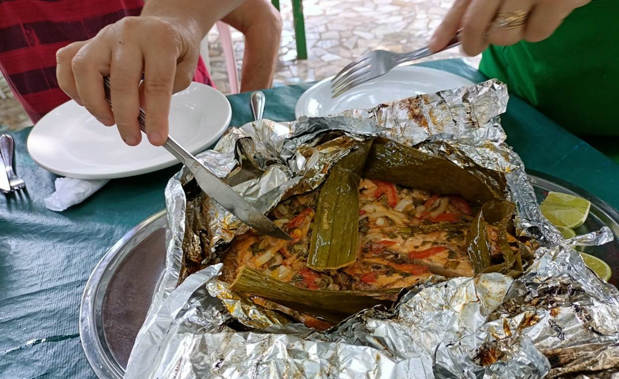 עם ירקות תוך עלי בננה ונייר כסף במסעדה