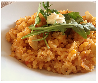 כוסות ציר דגים חם (אפשר גם מים אבל פחות טוב) 1. בסיר מטגנים את הבצל בשמן קנולה עד ששקוף 2. מוסיפים את האורז ומטגנים עוד דקה 3. מוסיפים את הציר חם, רכז עגבניות, דג, עלה